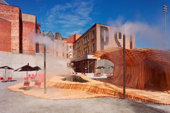 Sponsored by The Museum of Modern Art and P.S.1 Contemporary Art Center, the Young Architects Program is an annual competition that gives emerging architects the opportunity to build projects conceived for P.S.1’s outdoor courtyard in Long Island City. Selected as the winner in 2000 to create a structure for P.S.1’s courtyard, SHoP designed Dunescape for the art center’s summer series event, Warm Up 2000. Designed to provide a variety of ways to enjoy the summer weather, visitors can lounge, socialize, sunbathe, wade in pools, or walk through a spray of water mist to cool off. SHoP's model of the proposed design was acquired by the MoMA in 2006.