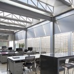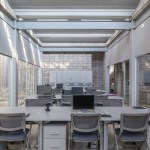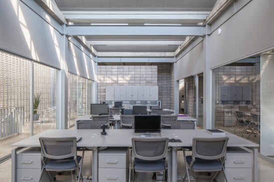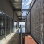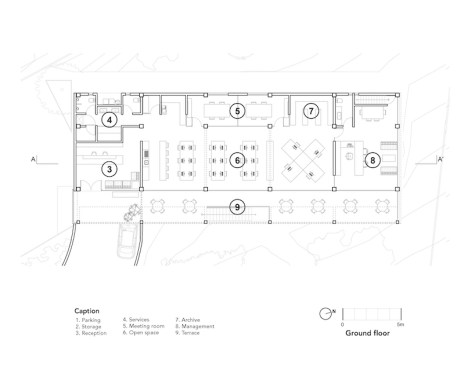 The program takes place in a grid that divides the project into three longitudinal blocks that contain and order the different uses: the first is made up of auxiliary services and spaces, the second corresponds to the working area and the third one, houses a social area that takes the shape of a large terrace.