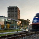 The design of Durham Station references the City of Durham’s rich cultural history by using materials selected to respect the visual and tactile texture of masonry found in Durham’s tobacco warehouses. The design incorporates these materials and renders them in a more contemporary industrial aesthetic, while embracing the equally strong tradition of innovation and progress. The predominantly glass exterior walls offer a secure environment, visibility of transportation activity, and views of the downtown area, Historic American Tobacco, West Village, and the surrounding areas. Articulated metal roof forms, masonry, and concrete embraces the location’s industrial context while acknowledging the dynamic movement of Durham Station’s transit program and its adjacent intermodal transit facilities.