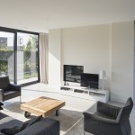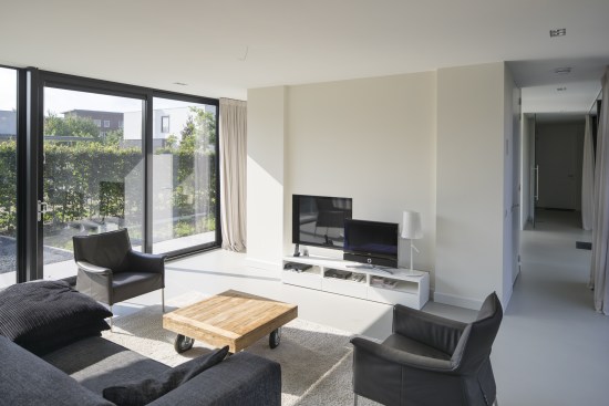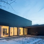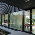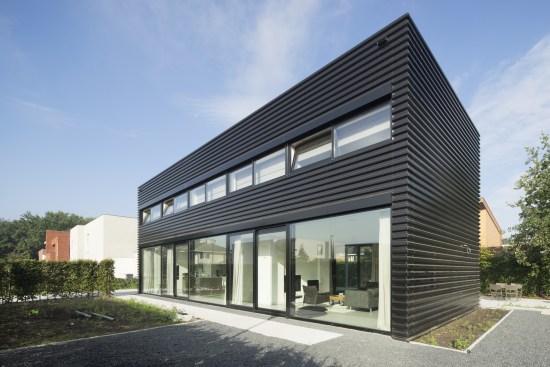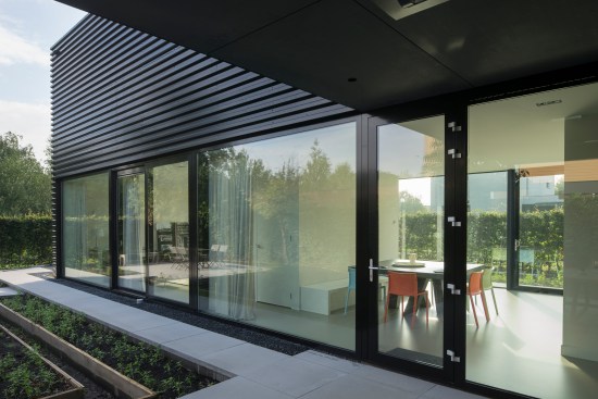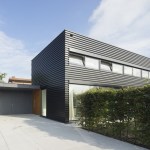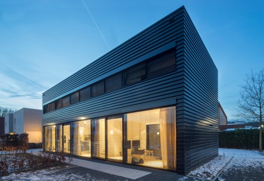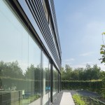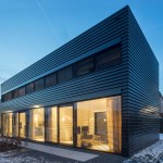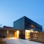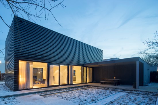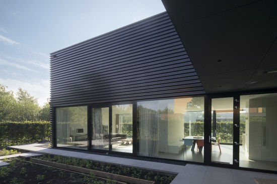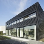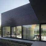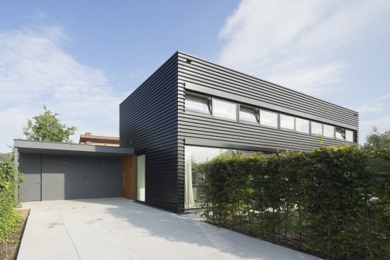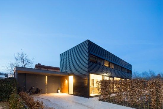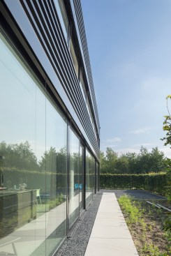 On a modest plot in Goirle the Netherlands which proved difficult to sell, we have designed a plan that best leverage the opportunities of the site. The building plot is situated at the middle of the plot. It was this building regulation that gave rise to design the master volume as small as possible, leaving plenty of backyard remained. This two-storey main volume has an industrial character. The black tight ribbed steel stands out with horizontal bands in the façade. The low-rise volume is made of a fiber cement slab in various sizes. The living space on the ground floor level is transparently as a continuous open space designed . The large windows give a clear view of both front and rear of the plot. On the floor this window strip is made narrower. Solar protection ensures that each space can be individually chosen to blind.