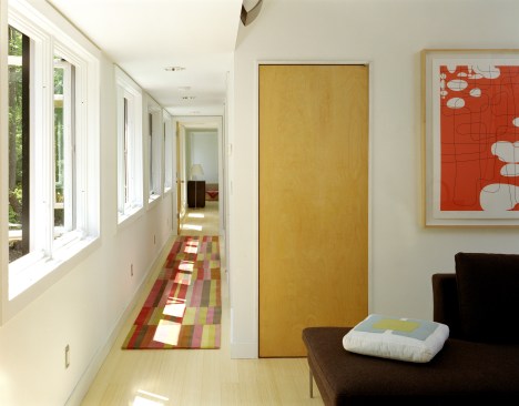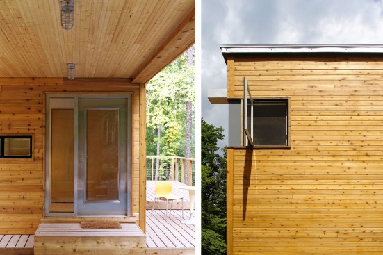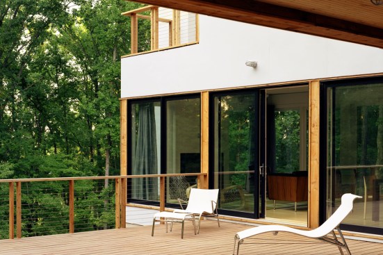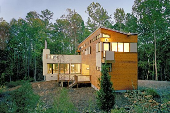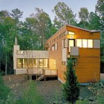 The winning entry of the Dwell Home Design Invitational is situated on a hilly site in North Carolina among seven wooded acres. The home takes full advantage of its natural surroundings: bringing in the woodland views and natural light through plentiful windows, generously sized decks off the front and rear facades, and a roof deck with an outdoor fireplace. With 2,400 sf divided among five prefabricated modules, the home offers compact and efficient quarters made up of large open living spaces and cozy private enclaves. To meet the necessity of creating a livable floor plan and a well-orchestrated flow of space, the ground floor is an open plan module containing a living room, dining area, and a kitchen that can be entirely open to the outside or enclosed by a curtain. Sensitive to the clients’ desire for more defined communal/private spaces, the private spaces are more compartmentalized making up the second floor of the home. The master bedroom at one end of the volume looks out onto a grove of trees, and two bathrooms and a guest/office run along the same axis. The design of the home responds specifically to the location and immediate surroundings. The construction process leveraged the efficiency of the modular industry whereby approximately 80% of the house was built in a factory. By utilizing the opportunities available for off-site construction, the time required of crews on-site was significantly diminished, minimizing the environmental impact on the local ecosystem, the waste that is typically deposited on or near the site, and the transport of crews and materials. The Dwell Home has become a precedent in demonstrating the superiority of prefabricated building technology over site-built homes in terms of environmental factors, quality and efficiency of the building, and the cost and speed of construction and design.