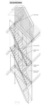 Each piece—whether vertical support or horizontal tread—was first cut on a CNC laser-cutting machine to achieve a custom profile. The pieces were then bent on a brake press and joined for a zero-tolerance fitting in the fabrication shop. A custom joint was fabricated to extend the height of the vertical structure members, and Dean/Wolf spaced the joints so that each is located just below a tread on the upper flight of stairs, to impart a certain logic to the disruption. The vertical members were hung from the top-floor ceiling, under a skylight, and the treads were slipped into pre-cut notches in the vertical members and then fastened into place.