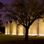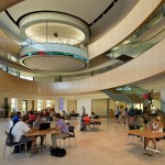 The design team researched glass technologies and developed a cream colored ceramic fritted insulating glass unit with mirror glass back panel which creates a moiré pattern over the surface of the pavilions resulting in a three dimensional appearance that is similar in color and modeling to its stucco-clad neighbors. The south and west sides of the rotunda are surrounded by a custom bronze screen that utilizes an arch motif which recalls the university’s treasured campus arcades. The screen is designed to shield the glass rotunda from harsh solar gain.