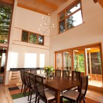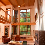 The final design features three “pods.” The individual living spaces were oriented toward the south in order to capture the view of the river and Eagle Rock and to maximize daylight exposure in the heavily-wooded site. With a ceiling height that exceeds 21 feet, the middle pod offers a spectacular view of Eagle Rock from either floor. “The height of the room makes it possible to experience Eagle Rock from its peak down to the river”, says lead architect, Richard Shugar. From the loft space, a bridge crosses above the dining room and living room area to an upper-level outdoor porch where you can actually see fish swimming in the water.