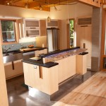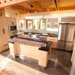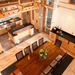 Window seats overlooking the river, furniture grouped in front of the fireplace, an over-sized table to gather around, a bar counter to lean against and visit with the cook; these spaces are made for the family to be together. The center pod contains all the cooking, full bath, and an upstairs sleeping loft for the grandchildren.