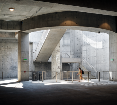 Knowing that the need for parking will eventually decrease over time, the team designed the garage to be transformed into academic or other campus space in the future. The design incorporates higher floor-to-floor dimensions, heavier floor loads for anticipated occupancies, accommodation for connections to daylight and landscape above, and other strategies that will enhance the transformation of parking space into people spaces.