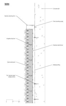 Eichmann and Hawry also like GSky’s irrigation technology. Some systems run a single drip line over the top of the wall, but GSky runs lines through every panel; irrigation zones are determined by site conditions and plant layout, says Eichmann, and flow rates can be adjusted from .5 to 3 gallons per hour, as needed. GSky also provides 24/7 monitoring via a network of sensors embedded within the growth medium, helping ensure that a green wall stays verdant.