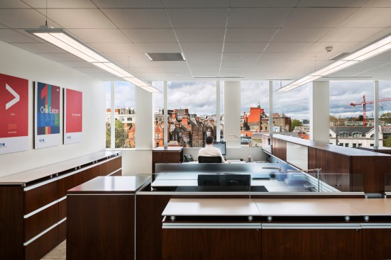 Recessed cast glass brick flanks the clear glass openings resulting in a 38% increase in daylight over the 1970 building’s façade. The cast glass brick respects how the material was used historically to add more daylight and creates a more open, productive work environment for the LEED Gold project.
