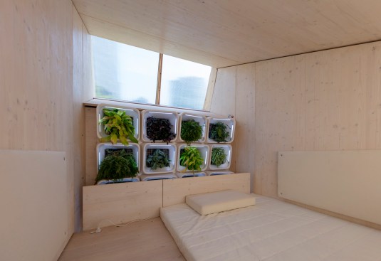All required energy is produced by a combination of traditional photovoltaic panels on the roof and an integrated concentrating solar façade from HeliOptix, which contains small solar cells in the air gap of a double-glazed façade that both generates energy and serves as sunshades to limit heat gain and reduce overall energy needs. Eighty percent of rainwater is captured, stored, and filtered for potable use. All graywater is retained to provide irrigation for a microfarming wall, which if deployed on both long elevations could provide up to 65 percent of the fruit and vegetable servings recommended per family each year. An indoor air-purifying plant wall, located in a narrow double-height space above the kitchen and adjacent to the loft sleeping space, promotes good cross ventilation and is predicted to remove 99 percent of small particulate air pollutants from the ELM’s environment.