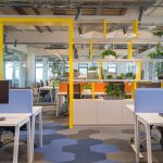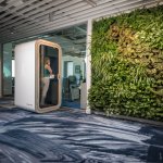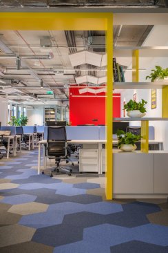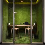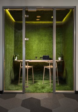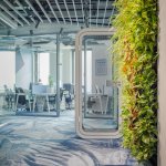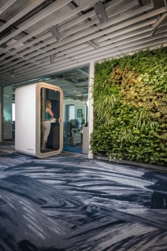 Custom furniture introduces notes of modernism, while living walls framing the surfaces intertwine delicately with strict geometric shapes. Some of the desks are equipped with lifting mechanisms, permitting employees to alter the height of their table or to work from a standing position. The ceiling is fitted with acoustic panels.