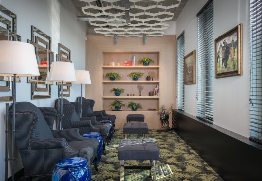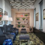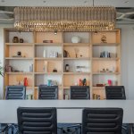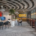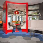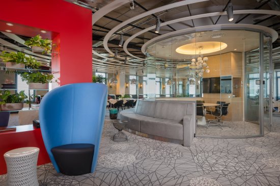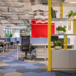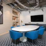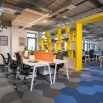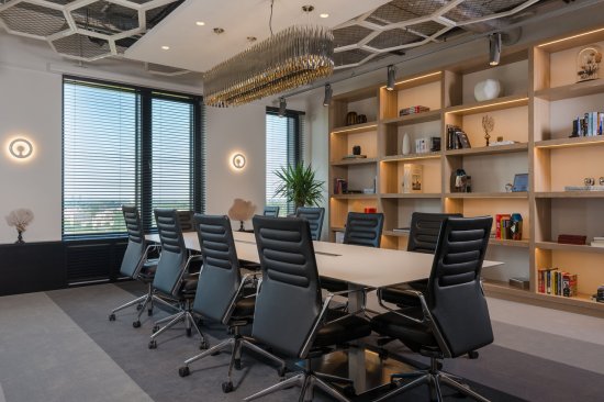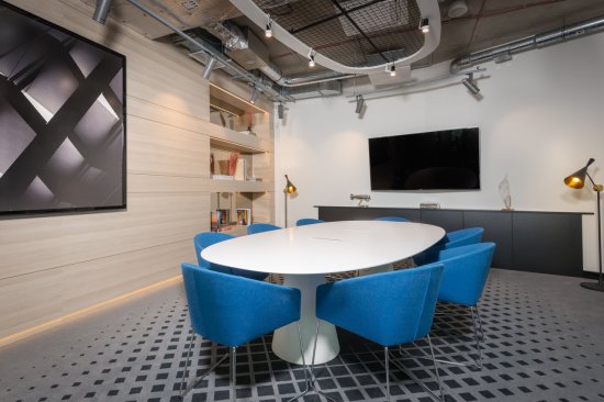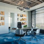 The office interior contains modern, striking elements and complex geometry: sharp lines, bold patterns, circular panels, hexagonal tiles in a checkered layout. The walls are decorated in an eclectic manner, relying on the shapes of linear geometric figures. The main colours are muted, decorated in calm white, grey, and pale blue, and accented by bright pieces of furniture and contrasting panels.