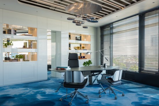 On each level, the workplace is divided by department and decorated according to the profile of the specialists occupying the area. The manager of each department is positioned in such a way as to have access to each relevant section. The reception is decorated with geometric snow-white panels, complementing the labyrinthine maze stretching from floor to ceiling. The carpet is decorated with white and metallic shades.