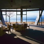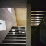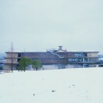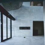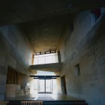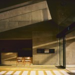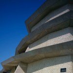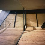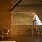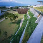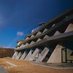 Wind from Lake Biwa flows through the building traveling from north to south, this is achieved by changing the angle of the wall extending from east to west. Reinforced concrete slabs, like folded plates, supported by oblique pillars aim to create a space where structural beams are invisible; the slab’s unique shape can only be perceived from the spaces below where the concrete is exposed. The slab shape also plays the role of eaves, controlling solar radiation. The uppermost slab works as a green-roof where the surrounding natural vegetation continues growing.