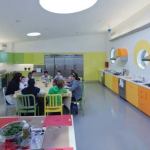 The Kitchen Classroom provides space for up to thirty students to prepare and enjoy meals with vegetables harvested from the school’s organic garden as well as office space for Edible Schoolyard NYC to accommodate on-site staff. The façade of the kitchen classroom is clad in a low-cost material – cementitious shingles, which are reinterpreted as pixels and utilized in a tighter than usual pattern to make a graphic flower pattern inspired by Venturi Scott Brown’s BEST façade. The façade also shapes the interior space through the placement of porthole windows and circular skylights at the center of the flowers, creating a dynamic and fun atmosphere. Inside the Kitchen Classroom, cabinets lining the walls are painted in a thirteen color gradient based on the colors of the façade.