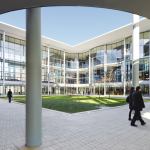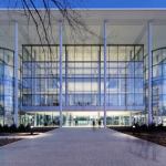 colonnade, under a pale canopy, is a deeply modulated glass curtainwall.