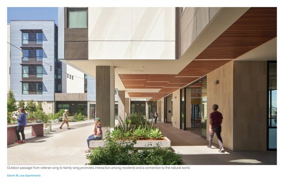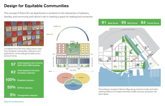 At the Edwin M. Lee Apartments, two local non-profit organizations integrated their respective user groups – low-income families and formerly homeless veterans – into a single community that benefits the residents and the neighborhood. Low-income, multi-bedroom affordable family housing is scarce in San Francisco. Per a Planning Department report on affordable housing, only 29% of San Francisco housing units have 3 or more bedrooms, compared to a Bay Area average of 54%. Low-income families who work in San Francisco are increasingly forced to commute long distances for affordable housing. Former Mayor Ed Lee, San Francisco’s first Asian American mayor, was a long-time advocate for affordable housing and for the Chinatown Community Development Center (CCDC), a non-profit which evolved from addressing the needs of Chinatown residents to providing services to other neighborhoods in the city. At the Edwin M. Lee Apartments, CCDC added 52 two- to three-bedroom housing units to the city to house low-income (50%-60% AMI) families, allowing families room to thrive and maintain residence within the city. In addition, supportive services for veteran homelessness is a significant need in the Bay Area. Homeless veterans account for 10% of all homeless adults, and most are over the age of 55. Homeless senior veterans have higher rates of hospitalization and age-adjusted mortality, requiring support and resources. The Bay Area has one of the highest concentrations of veterans in the country, and 58% of homeless veterans in California are unsheltered. Mr. Lee was an advocate for eliminating veteran homelessness, and accepted the Mayors Challenge to End Veteran Homelessness in 2014. Non-profit organization Swords to Plowshares has supported homeless veterans in the Bay Area for decades. This is the non-profit’s first new construction veterans housing project. 62 units have been leased to formerly homeless veterans, who will also receive on-site support in the form of counseling and career services. The veteran residents are a diverse group: all of the veteran residents are disabled, and 30% have two disabling conditions and 42% have three or more disabling conditions. 50% of the veteran residents are BIPOC and 3% are transgender. These residents face multiple challenges including mental illness, chronic substance abuse, HIV, service-related conditions including Post-Traumatic Stress Disorder (PTSD), Traumatic Brain Injury (TBI), and other mental and physical disabilities. While the current residents were not assigned during the project’s design process, their needs were anticipated by working closely with these established non-profit developers and their decades of experiences with these communities. The design team researched post-trauma design methods, including Ideo’s Wounded Warrior concept home and Perkins and Will’s Posttraumatic Understanding, designing to enhance a sense of community among different user groups, and specific methods to design a space for calm and healing in an urban context. “This is a great place, a really great place to be at. It's safe, it gives you peace of mind and security. It also makes you feel comfortable because you're around people that's willing to help you if you need help.” – Richard, resident, US Army 1977 – 1981