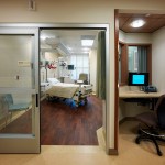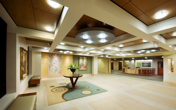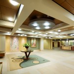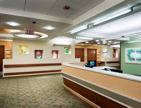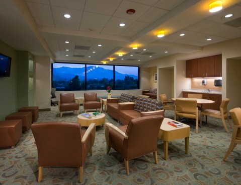 The Annenberg Pavilion blends soft, humane interiors with the architectural design to create a therapeutic, healing environment. Welcoming patient rooms provide a luxurious surrounding for the patient and family while facilitating patient care. Amenities include family and visitor areas, window-beds for overnight stays by family and guests, and hotel-like suites. Nature permeates the Pavilion through large windows that filter warm, natural light; water structures in the first floor lobby trickling soothing streams; and a courtyard healing garden that fosters healing, peace, and serenity.
