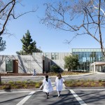 Located on an edge site of its Mountain View campus, the 55,000 sq. ft. Behavioral Health Services Taube Pavilion is a high visibility marker of ECH’s commitment to providing a safe and comfortable healing environment where patients are treated with respect and compassion. The building’s face to the community is light in spirit, welcoming, and non-institutional, helping to destigmatize mental illness and its treatment. The entry lobby is visually prominent and welcoming: a two-story glass volume easily recognizable amongst the mature heritage trees on site. The material palette of variegated aluminum panels, terra cotta-colored cement board, and board-formed concrete responds to the park-like setting of the existing campus. A covered walkway secures the central patient garden and connects the Pavilion back to main hospital.