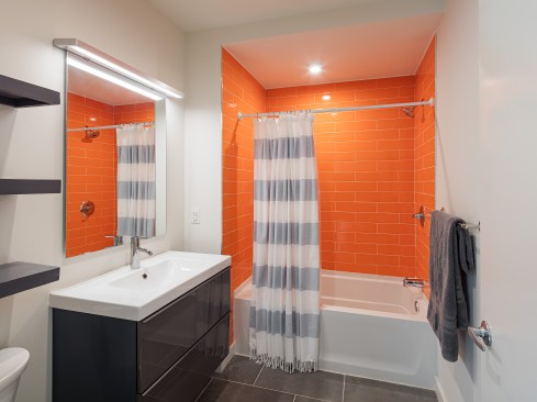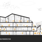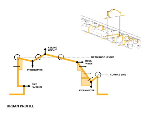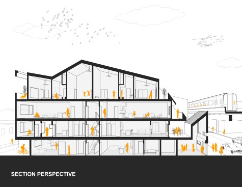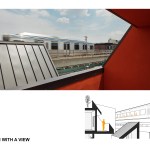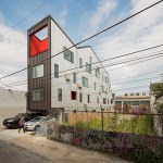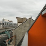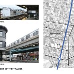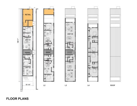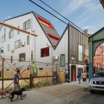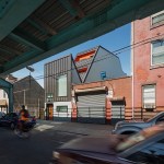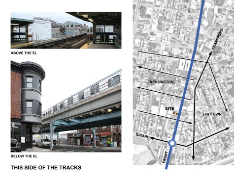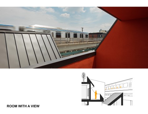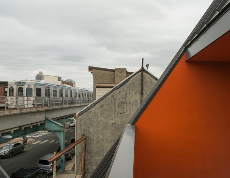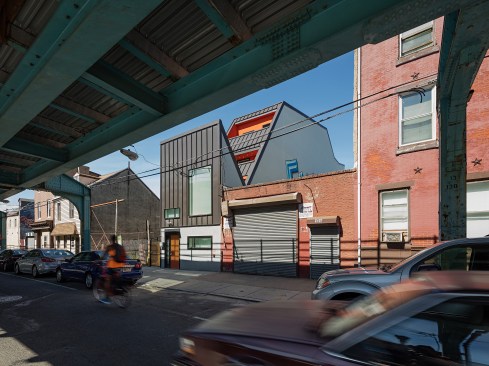 As marginalized urban areas transition into desirable neighborhoods, seemingly problematic contextual elements like adjacent vacant land and elevated railroads can be treated as productive design constraints. Historically a divider, the elevated train line running along Front Street in Philadelphia’s Kensington neighborhood is becoming an attractor for new retail and nightlife. This 6-unit apartment building shifts program to the long edge of a narrow site along the busy Frankford-Market elevated Blue Line in East Kensington, creating an interior façade facing an adjacent vacant parcel. An already narrow site is made thinner, unlocking the long wall of the plan for south-facing light, air, and views. With a roofline that connects the dots of a quirky zoning envelope, the elevation juxtaposes housing above with a storefront tucked underneath the elevated train line. As a reaction to the owner’s concern about living directly adjacent to the elevated train, the project emphasized an intimacy with the railroad that looked to turn a liability into a surprisingly novel asset. The north-facing blank property line facade creates an opportunity for art and signage oriented toward viewers riding south on the train.