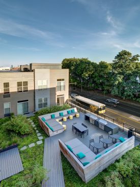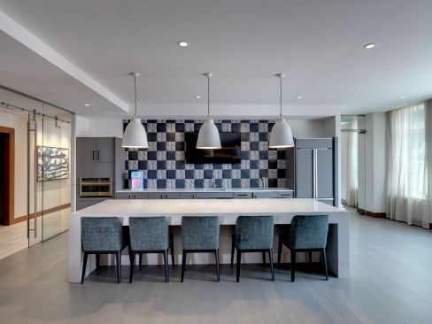 Elan Union Market has two buildings that are attached by an elegant, elevated glass walkway – a key defining feature of the project. The development includes an array of thoughtfully designed amenities including a modern clubhouse with a variety of social spaces, an entertainment kitchen, art gallery, yoga room, and top-of-the-line fitness equipment. The pet-friendly community offers open green space, multiple outdoor courtyards with grilling stations, a swimming pool with sun deck, as well as bicycle storage and repair stations. Shared indoor and outdoor community space includes a resident lounge with billiards and a tech center with meeting rooms, a coffee bar, and workspaces.