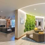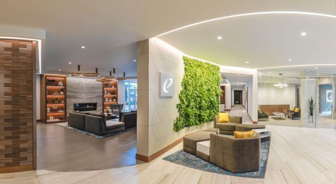 The use of earthen wood throughout adds depth, character, and warmth to the interior spaces while the splendor of a living green wall connects tenants to the natural environment. Affluent styling and familiar rich tones such as nutmeg, gold- and pewter-like metal finishes and slate blue hues against neutral stone define a contemporary-inspired style.