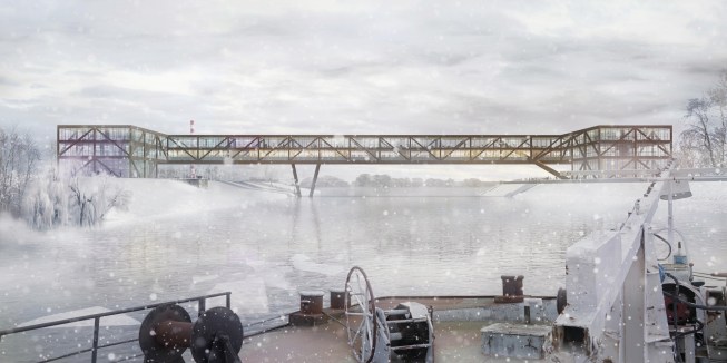 The concept of multifunctional bridge is well known. Ponte Vecio, Rialto Bridge, Covered Bridge – Lovech and this year’s Jishoy Art Museum China or the Bridge House in the Russian forest are divided by centuries and technologies available and used. The one thing they all have in common is the central, longitudinal axis of the construction.
