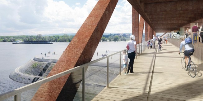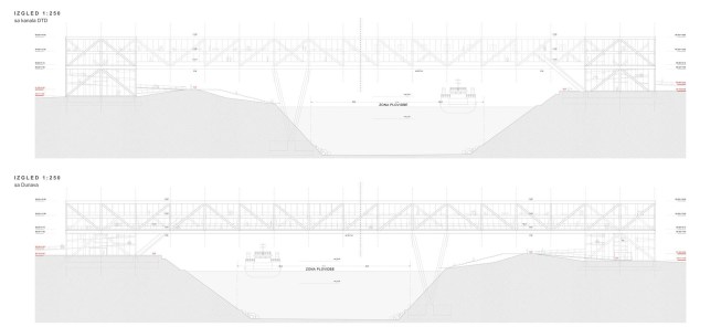 Eccentricity of the concept surely is the direct – morphological consequence of the slow but steady currents of the DTD canal. The main axis of the bridge is pushed downstream by 30m with the aim to change the status of the static, centric observer to the status of eccentric, forward leaning observer. It’s western shadow reaches the edges of still murky Danube waters.