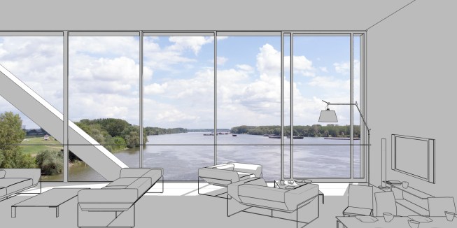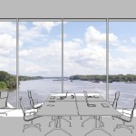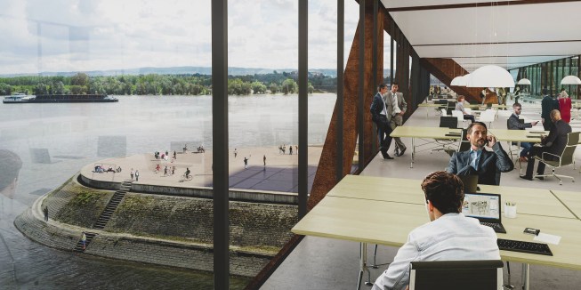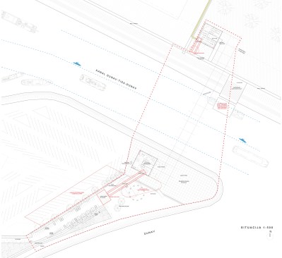 The total of the 200m of this infrastructure route becomes catering / shopping street overlooking the Danube waterway for miles downstream. This privilege is enjoyed also on the upper level 5m above in both program options of the office or hotel.