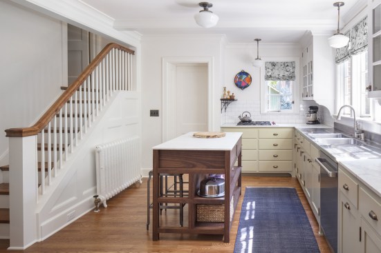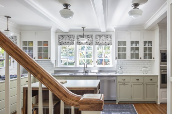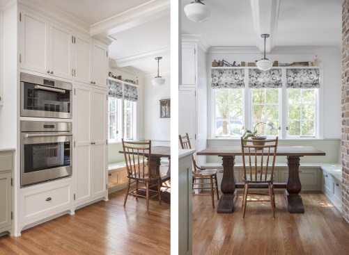 FORWARD was asked to redesign a kitchen and breakfast area in the historic Electrical House, which was J.C. Nichols’ first model home. The current owners see themselves as stewards of this historical house and were interested in finding a solution that both met their contemporary needs and felt as though it could have always been part of the house. The house had a small addition that had been done decades ago. This provided the space required for a functioning kitchen, but was divided into 3 spaces. The first move we made was to rework the plan to make one large kitchen and locate the half bath and a butler’s pantry into a central core that separates the more formal functions from the service components. The bath now opens of a small service vestibule between the entry and rear service stairs. The rear stair (which had been used as a mechanical room in a previous renovation) was put back into use and opened to connect to the kitchen. The creation of the new larger kitchen required extensive structural work to support the multi-story load bearing brick structure. It was decided to leave this brick exposed in the final design. The design of the kitchen itself utilizes modern appliances and conveniences, but is designed to fit within the historic context and not feel like a complete reconfiguration. The intent was to appear as though nothing more than a finish update was all that had been done to the original house.