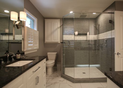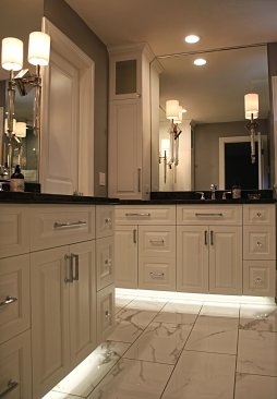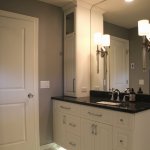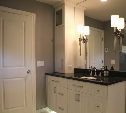 Now that the children have grown and left the house, the owners finally wanted to make their dream master bedroom en suite a reality. The existing master bath was a 6' x 8' space with a small vanity and a fiber glass shower with dated tile and colors. To create this project, the existing master bedroom was reduced by 4 feet & that space went into the new master bath.The remaining space in the old master bedroom became a walk in closet and the wall between the now closet and another bedroom was opened up and french doors were installed. The closet was removed from the adjacent bedroom to give them a larger, new master bedroom and the existing entry door was moved to the end of the hall giving them entry from the new master bedroom into the master bath. The re designed master bath consists of two identical vanities with towers and a 4' x 5' tile and glass wall shower. The walk in closet was custom designed for the owners needs. While this remodel was being done the main bath was also updated with all new plumbing fixtures, vanity, tile and light fixtures. The result was even better than the owners had ever dreamt of!