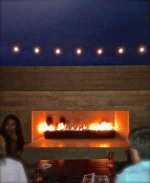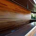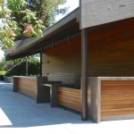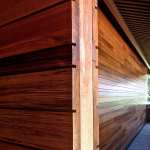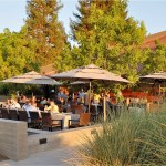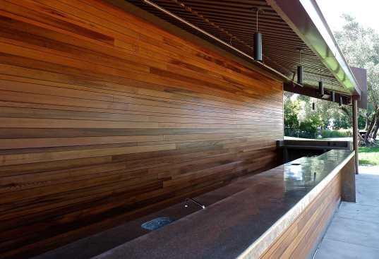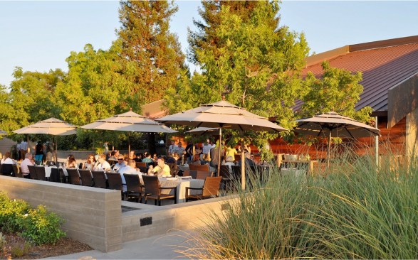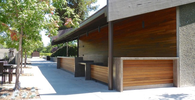 Walls of board-formed concrete and stone wrap a new outdoor tasting terrace, providing enclosure while opening to views of the vineyards and concert green. A bosque of pistache trees forms a ceiling to this outdoor room containing the elements of fire, water and wood. Redwood wine barrels were custom milled to sheath the exterior wall of the cellar and tasting bar.