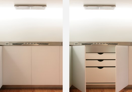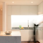 Glass, stainless steel, and marble define the kitchen for a private residence in Chicago. The client wanted a modern kitchen that could be part of the living space of the house. With a carefully selected palette of materials, we addressed the client’s needs while exploring concealment, light, and tactility. Back-painted glass is used across all vertical surfaces, concealing drawers as well as appliances such as the dishwasher, refrigerator, and ovens. With no visible hardware, it becomes a continuous surface that varies as the light conditions change. A translucent acid-etched glass backsplash conceals LED lighting, becoming a frameless, seamless glowing surface. Stainless steel creates a continuous countertop and seamlessly integrated sink with a non-directional finish, lending a softness and glow to its appearance. Tactility and functionality define the different edge details. Marble clads the ample kitchen island, visually becoming a solid and warm surface that can be used as part of the kitchen as well as for social gathering. Glass doors open and pocket into the island revealing two ovens, drawers, and extra storage. While the palette of elements used in the kitchen is minimal, their textures, application, and relationship create a space that is complex and rich in qualities.