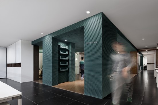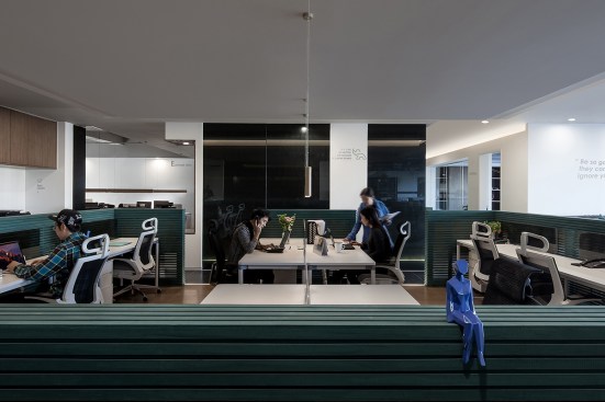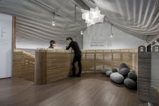 In the first layer, we cut and broke the single geometric space, while being able to be recombined and re-displayed, it feels like that it shows and returns to the original space form. In this way, internal communication function of Elephant-Parade's office is maintained while being as vivid and interesting as jigsaw puzzle. Meanwhile, it solves the problems of many practical functions, such as lighting and ventilation, line organization, functional partition, etc.