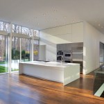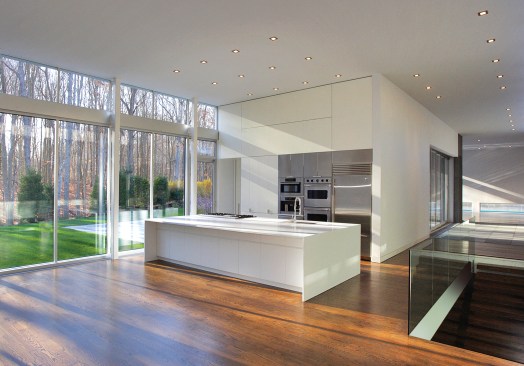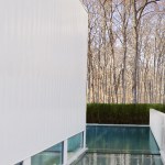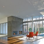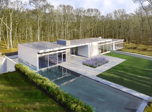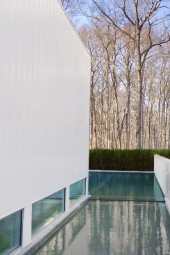 The client wanted a swimming pool to be the center of the home’s layout and activities. We accomplished this by creating an L-shaped plan where one leg is a two-story house and the other a 115-foot long pool. The living room sits at their intersection where it is surrounded on three sides by the pool. At the floor level 2-foot band of perimeter windows enlivens the space with water views and reflections while giving the sense of floating. In similar fashion the opposite end of the house cantilevers over a sloping lawn where it has views to the forest treetops.