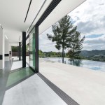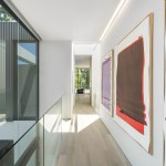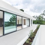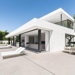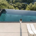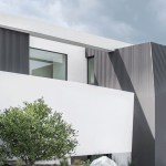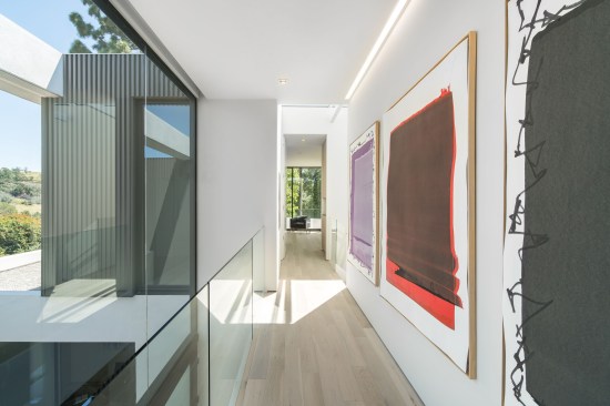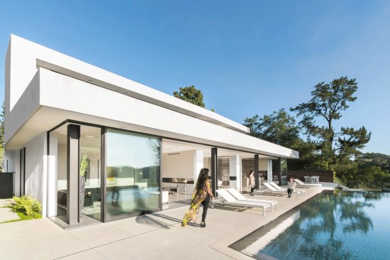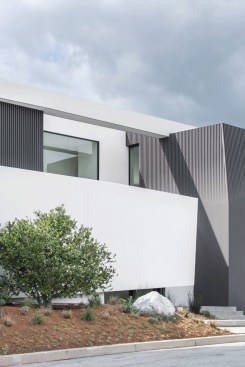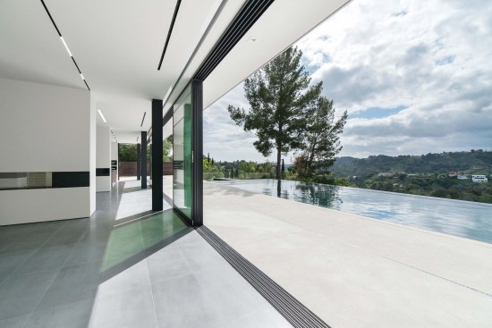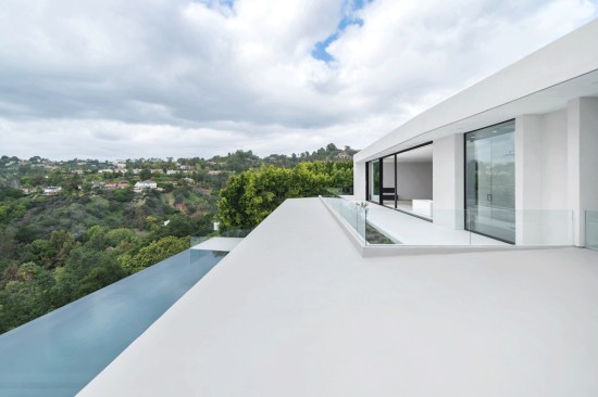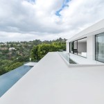ELL is a 5,500SF ground-up Beverly Hills Spec residence designed for Luxe List Home. The building is located at the crest of the Benedict Canyon hillsides, overlooking the entire serene landscape of the Beverly Hills neighborhood. The project is loosely situated within the footprint of a former, now demolished, one-story 1950s residence. A design-build methodology was employed and streamlined to meet a challenging schedule, with the dynamic design process that evolved during and prior to construction. The methodological constraints of the project led to explorations of an elevational architecture, focusing on systemic alignments and misalignments as tools to create a dynamic, yet minimal façade. Formal elements are subtle, accentuated, and exaggerated. Planes are simultaneously thickened and destabilized through the opening of corners and separation from the ground surface. This technique allowed maximum freedom in developing a loose plan that emphasizes zones rather than rooms, which is played out with various degrees of privacy; the building is obscured to the street-front, yet completely open to the scenic view in the West. The ground-floor opens up to the elements using the architecture as framework for views of the landscape beyond. The second floor, which features the most private areas has a discreet roof terrace, which is set into the roof surface to exercise another dialogue between privacy and openness. The entrance is shielded by a long, heavy, elevated wing wall that not only forms part of the ground floor and sideboard enclosure but also embraces an interior courtyard with an entry pond. This allows the east facade to be completely opened up over two stories while being visually almost inaccessible from the street. The deck and zero-edge pool cantilever over the steep hillside and are extensions of the floor plans rather than landscape elements. This enhances the continuous interplay between interior and exterior throughout the house and artificially increases the footprint. The material vocabulary of the project is reduced to three related elements. The extensive glazing, with its reflective and transparent surfaces and thin dark glazing frames, is starkly contrasted by white stucco facades. Wooden slats serve as a textural mediator through the use of parametrically generated undulation. Inside, material contrasts continue. Expressed through sharp-edged geometries and articulated datum, juxtapositions of white stucco, grey stone, and soft, warm wood surfaces unfold throughout.