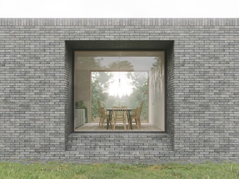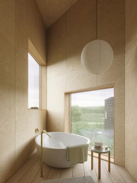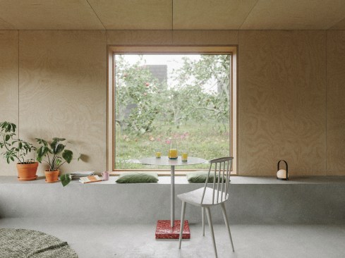 A simple palette includes gray-stained plywood “shingles” that clad the wood-framed houses and create an ambiguous scale for the objects in the landscape; interiors are finished in more conventional plywood sheathing.