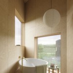 Visitors access the complex via an atmospheric brick-arched tunnel whose narrow confines provide a threshold between parking and landscape. Once inside the walled site, an entry pavilion in a simple, single-story volume provides shared living, dining, and kitchen spaces. Beyond that structure, the complex’s six guest houses are slotted on their own allées within the orchard, each taking the place of a handful of trees in the landscape. Each structure’s narrow ground level features living, kitchen, dining, and sleeping accommodations, and is connected via a spiral stair to two upper levels: a second that’s primarily an outdoor roof deck, and a third (dubbed “the perch” by the designers) with an indoor soaking tub overlooking the landscape. The upper volumes are contained within a rhomboid volume whose orientation varies from building to building to preserve privacy for each guest.