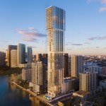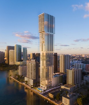 The 57-story residential tower features 100 luxury residences ranging from three- to five-bedrooms including den options, as well as duplexes and full-floor penthouses, measuring up to 4,000 SF in size. The slender glass-clad structure features a unique three-tiered telescoping shape with only two units per floor, providing direct unobstructed bay and city views from every residence. The building program called for smaller apartments on the lower levels, midsized apartments on the mid-levels, and larger units on the upper levels. The result is a 57-story reverse ziggurat. The small base opens the ground to allow for a pool deck and bayside garden. The west side reverse terracing also allows for a large elevated sunset pool deck. The hovering cantilever above add drama to both poolsides. The facades emphasize the form. The east and west elevations are simple horizontal cantilevers that emphasize the directional thrust forward.