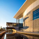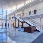 The building’s soaring, fluid architecture pays homage to the school’s aeronautical curriculum and welcomes prospective students, parents, visitors and donors. It includes a variety of dramatic architectural and engineering features: a cantilevered administrative block, an undulating steel roof, an expansive atrium, a glass curtain wall engineered to resist hurricane- and tornado-force winds as defined by Florida code, and an interior bridge connecting the administrative and hospitality suites.