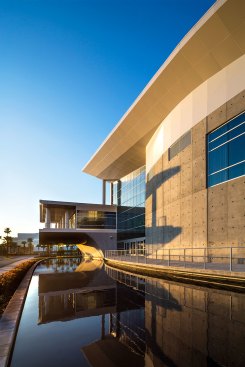 Surrounding the building, water is an essential element of the landscaping. Reflecting basins were placed to the east and west of the welcome center. The building’s reflections in the basins extend the design further into the site, and the reflected morning and afternoon sun serve to animate the building forms. The project’s interior features simple finishes; concrete, glass, intricately patterned terrazzo flooring and warm dark-espresso wood compliment the exterior’s aesthetic.