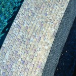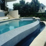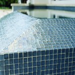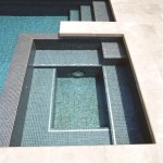The intricate pool system starts with the slightly raised, square-shaped therapy spa that’s ringed on three sides with Limestone coping tiles. The only open spa wall is the exposed top infinity edge that provides direct access into the pool. The infinity spa lazily overflows the exposed front wall beginning the pool’s complex system that’s mostly hidden from view. The signature design element Reed included in the spa design is the two, L-shaped, overlapping glass mosaic tile surfaced panels that serve as the spa’s stylish bench seating.