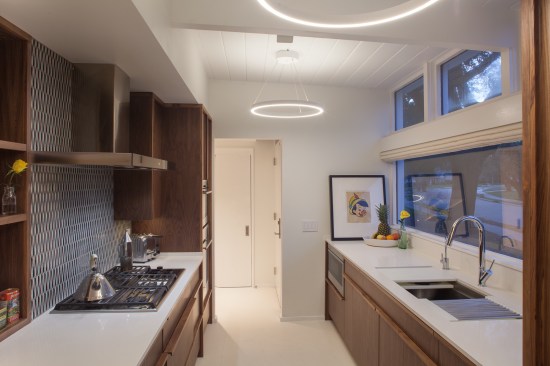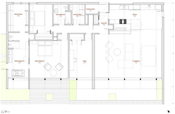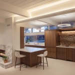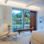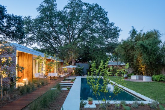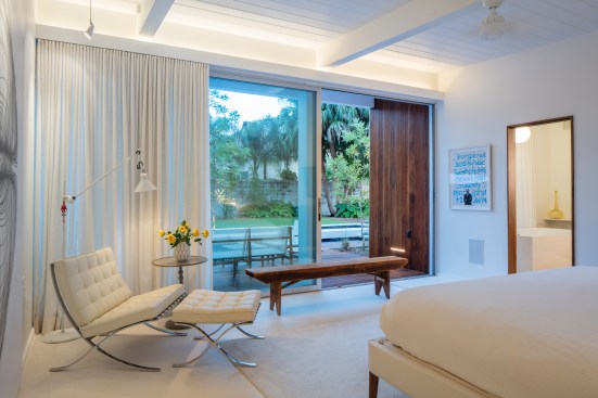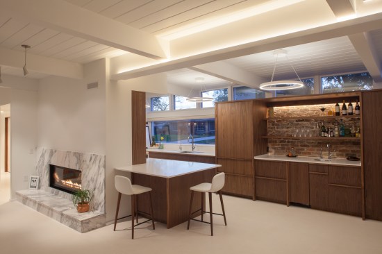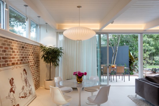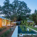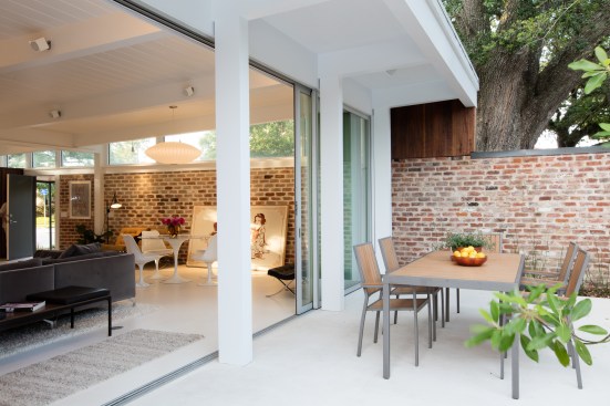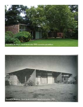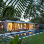 The Emerald St. Residence was designed by internationally renowned modernist architects Curtis and Davis in 1952 and represents one of only a handful of single family residences designed by the firm. The residence was published in a 1955 issue of Architectural record as the Dr. Stanley Cohen House, and is a prime example of Curtis and Davis’ trademark adaptation of modernist design principles, forms and structure to local climate, allowing for outdoor-indoor living. The residence was designed with an emphasis on its south façade, composed of sliding glass panels and directly connecting the main rooms of the house to the rear yard as well as patios spanning the length of the home. This façade was shaded via a large mono-pitch roof overhang, with exterior wing walls dividing the patios into public and private spaces. When the residence recently came up for sale however, it was a shadow of its former self. The design of the residence was seriously altered through a renovation and addition performed in the 1990s. Eliminating the design’s iconic overhang and wing walls, the interior footprint of the home was expanded by removing the original south façade and building a new façade at the edge of the roof. This new façade was constructed using standard residential sliding patio doors as opposed to Curtis and Davis’ custom panels, severely altering and in many cases destroying the minimal proportions of the original design. Without the overhang and wing walls the residence was continuously fighting against nature, and required two separate large HVAC units to cool a mere 2,300 square feet. In addition to this, the residence took on heavy water damage from Hurricane Katrina, rotting out almost all of the building’s structure. The current restoration efforts entailed an almost complete rebuilding of the residence. The original slab on grade foundation was elevated, without affecting the siting of the building in its landscape, to help protect from future natural disasters. The residence’s roof, interior partitions, and damaged exterior brick walls were also rebuilt, allowing for a re-introduction of the original design’s iconic overhang and exterior wing-walls. The existing modified interior footprint of the residence was maintained, with a new overhang and wing walls extending past the previously established location of the south façade. A new steel structural system was carefully concealed within the roof to allow for this extension. With the overhang and wing walls restored, the residence is now kept thermally comfortable via a small solar powered HVAC unit. Curtis and Davis’ original intent for the south façade is restored while honoring their firm’s legacy of embracing the most up to date technologies available. The façade is redesigned as a series of full height 9’ x 7’ sliding glass panels entirely disconnected from any columns or walls, allowing complete freedom of movement between interior and exterior. The new detailing of this wall system, as well as throughout the residence, reflects mid-century modernism through a contemporary minimalist lens. The new exterior wing walls are clad in solid walnut planks custom treated with a Weldtex striated pattern originally found on plywood panels on the residence’s exterior and interior. Custom designed millwork throughout the residence is also built in walnut to further connect the interior and exterior experiences. The wing walls divide public and private rear patios. The public patio directly connected to the living room is tiled in a large format French limestone tile that flows continuously from the interior. The interior is fully tiled in the same large format limestone further obfuscating the division between indoor and outdoor. A new pool, hot tub and freshwater pond are directly connected to the patios, with a private garden and bath accessible via the master suite. A repositioning of the master suite to the southwest corner of the residence fulfills the original intended master plan for the site as designed by Curtis and Davis in 1952.