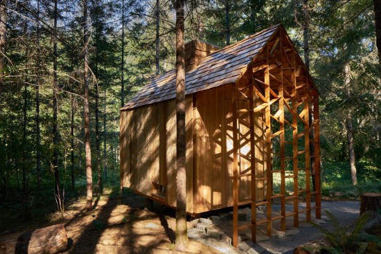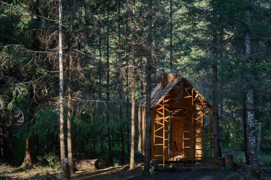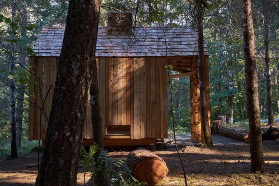 The structure’s floor and walls are made from Cross Laminated Timber (CLT), and the roof is a combination of CLT, glulam and dimension lumber. The structure is clad on the roof and sides with a simple build-up of CLT, shingles and timber siding.