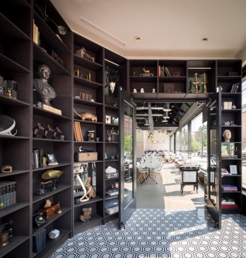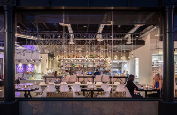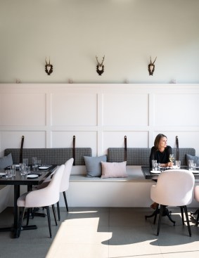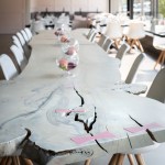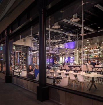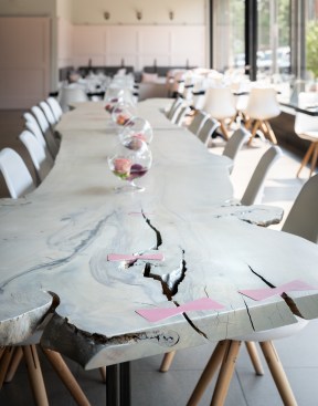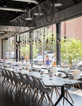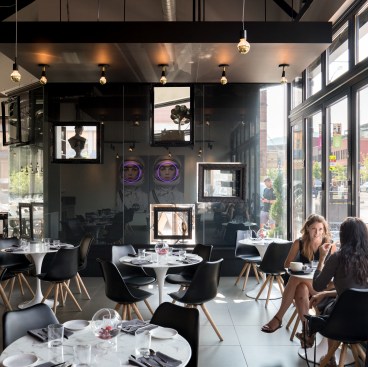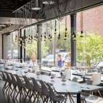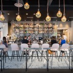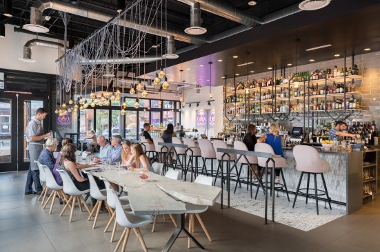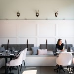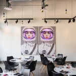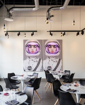 An avant garde restaurateur and two Brooklyn chefs of high repute planted the seed of a gluten inspired restaurant in Boulder, CO. Emmer, one of the earliest cultivated types of wheat has both wild and domestic strains. The paradox of wild and domestic resonated within the personality of the chefs, the cuisine and became the driving concept behind the design of Emmerson. Converting what was previously a fast-casual restaurant into an all-day upscale dining experience presented its challenges. A small budget and aggressive schedule meant that the design team was left to achieve the project’s goals under the existing structural and electrical constraints of the space. Transforming from morning pastries to chilled oysters and charcuterie in the evening presented design challenges. The new design accommodates a complex menu with dual purpose display cases and a resurfaced bar with marble veined quartz serving as a neutral backdrop for the curated cuisine. Soft pink, upholstered seating is peppered throughout the space providing diners with diverse seating options. A 20' long custom live edge hackberry wood community table draws the visitor’s eyes into the space as they enter the main restaurant. Floating above the communal table is an array of gold tipped bulbs that provide an elegant illumination; a creative solution to serving light to an expansive communal table with only one existing junction box above. Lastly, two identical portraits of Emmerson's mascot hang stout in the space; a powerful female astronaut with a pink neon halo deeply representing the concept of edgy yet soft, masculine and feminine, wild and domestic flair.