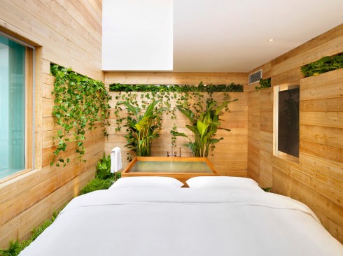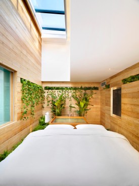 Guest rooms are designed to provide visitors with a peaceful respite from the energy of Beijing. Each room is uniquely designed with the goal of providing guests with a distinctive, unique and memorable experience. Rooms are organized around four emotions: serenity, desire, floating and mystery. Each room offers a very simple space where guests can be alone with their thoughts or their companions in total peace, at a remove not only from the city but from the world in general. The four room types offer striking contrasts, from the all-white serenity to the mystery room, panelled with rough-hewn timber sawn from trees on site.