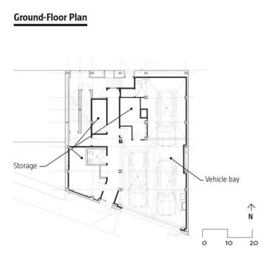 EMS stations are peculiarly hybrid creatures. Combining various elements of a firehouse, a clubhouse, and a parking garage, they have to serve as all-purpose depots for roving bands of EMTs and paramedics on 24-hour patrol. Ambulances return to refuel and resupply; crews check in at the beginning and end of each eight-hour shift, and senior staff stop by to monitor operations in the field.