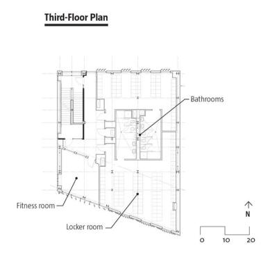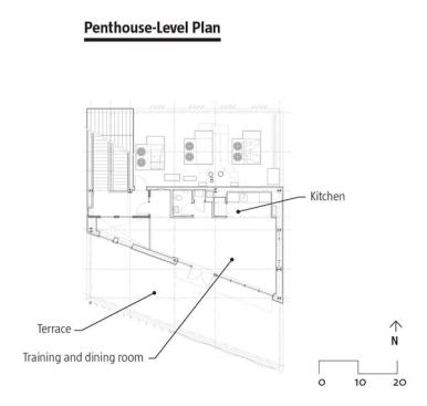 The shimmering brise soleil, hoisted over a base of glazed brick, helps to mask a complex mechanical system that nearly bursts out of the building frame. “No inch of the building is wasted here,” notes Samir Shah, program director for the Department of Design and Construction (DDC), the city’s representative on the project. Everything from a control booth and computer room, to decontamination units, to a narcotics storage closet with a blood-vessel-scanning lock are all stacked one atop the other on the building’s five above- and below-ground floors. A training room that doubles as a dining space in the penthouse and a connecting outdoor terrace (unique to New York’s EMS stations) add just a touch of luxury, as does a fitness room below—though all, in an ironic instance of momento mori, command sweeping views of the nearby graveyard.