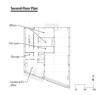 The building’s height, itself unusual for an EMS station, gave WXY the chance to make a virtue of the difficult site and hefty program. “By being that compact,” Weisz says, the EMTs “get to realize more social engagement.” By that, she means that the station’s overlapping functions—punctuated in WXY’s scheme by internal overlooks and atria—foster human interaction. The same applies outside the building’s walls, which the architects strove to open up with more apertures, more glass, and less bricks and mortar. “At the same time we were trying to make this a private space, we didn’t want to isolate them [the personnel] from the neighborhood,” she says. “We had to make that leap.”
