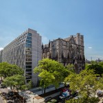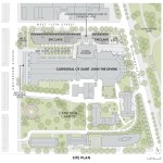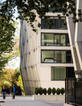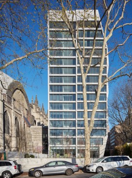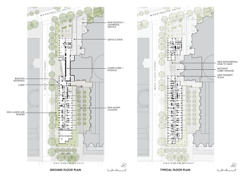 But none of this modesty diminishes an ambitious program that includes a sweeping lobby, an on-site art exhibition space, and gracious landscaping that connects the greenspace surrounding the cathedral to the neighborhood. Seen from the bottom of the hill to the east, Enclave’s wedgelike taper looks very much like a dislodged fragment of the cathedral, a flying buttress that has taken up residence alongside its historic neighbor.