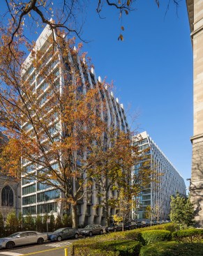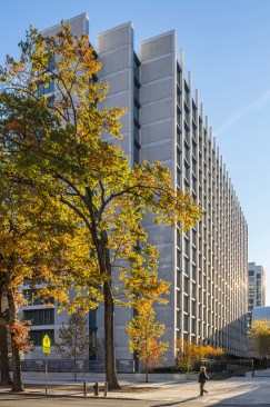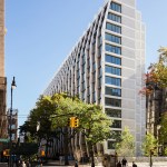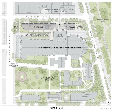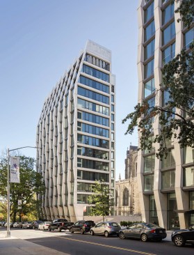 Into a daunting site in New York’s Morningside neighborhood, alongside the north flank of the hulking Neo-Gothic church St. John the Divine, Handel Architects has designed an apartment building that somehow manages to be equal parts eye-catching and self- effacing. Enclave at the Cathedral is a 430-unit apartment house that is 15 stories tall and scarcely a quarter block wide. To thread this challenging urban needle, the designers created a lateral façade, composed largely of vertical concrete piers, that ensures the focus remains on St. John’s stunning westwork. Meanwhile, to the north and south, the architects devised a dramatic ribbed exterior that plainly references the muscular structural systems of the church’s Gothic Revival architecture. This air of deference extends to Enclave’s silhouette, which steps down slightly as it approaches its neighbor. And rather than plunk down a single bulky structure, Handel divided the project into two buildings to leave the church’s north transept exposed.